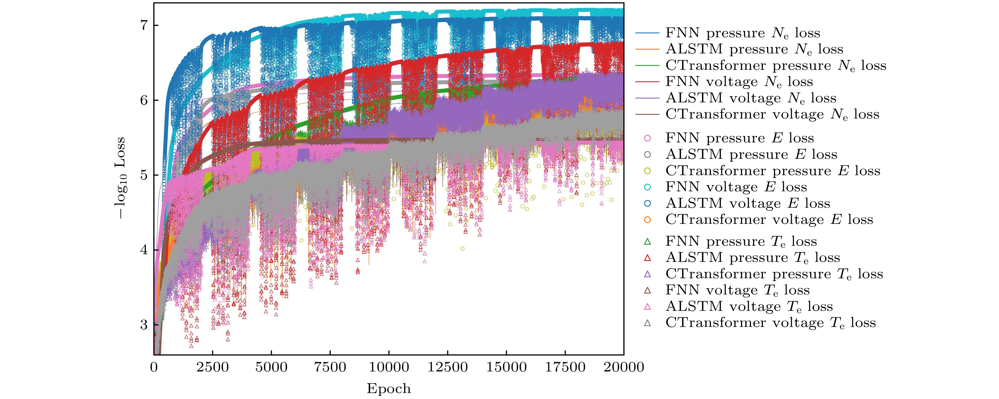 Figure 3. Convergence curves of training loss for the FNN, ALSTM, and CTransformer models on the electron density ($ n_{\mathrm{e}} $), electric field (E ), and electron temperature ($ T_{\mathrm{e}} $) datasets, where the loss values reflect the models' error performance. The horizontal axis represents the number of training iterations. The vertical axis represents the negative logarithm of the loss ($ -\log_{10} \text{Loss} $).