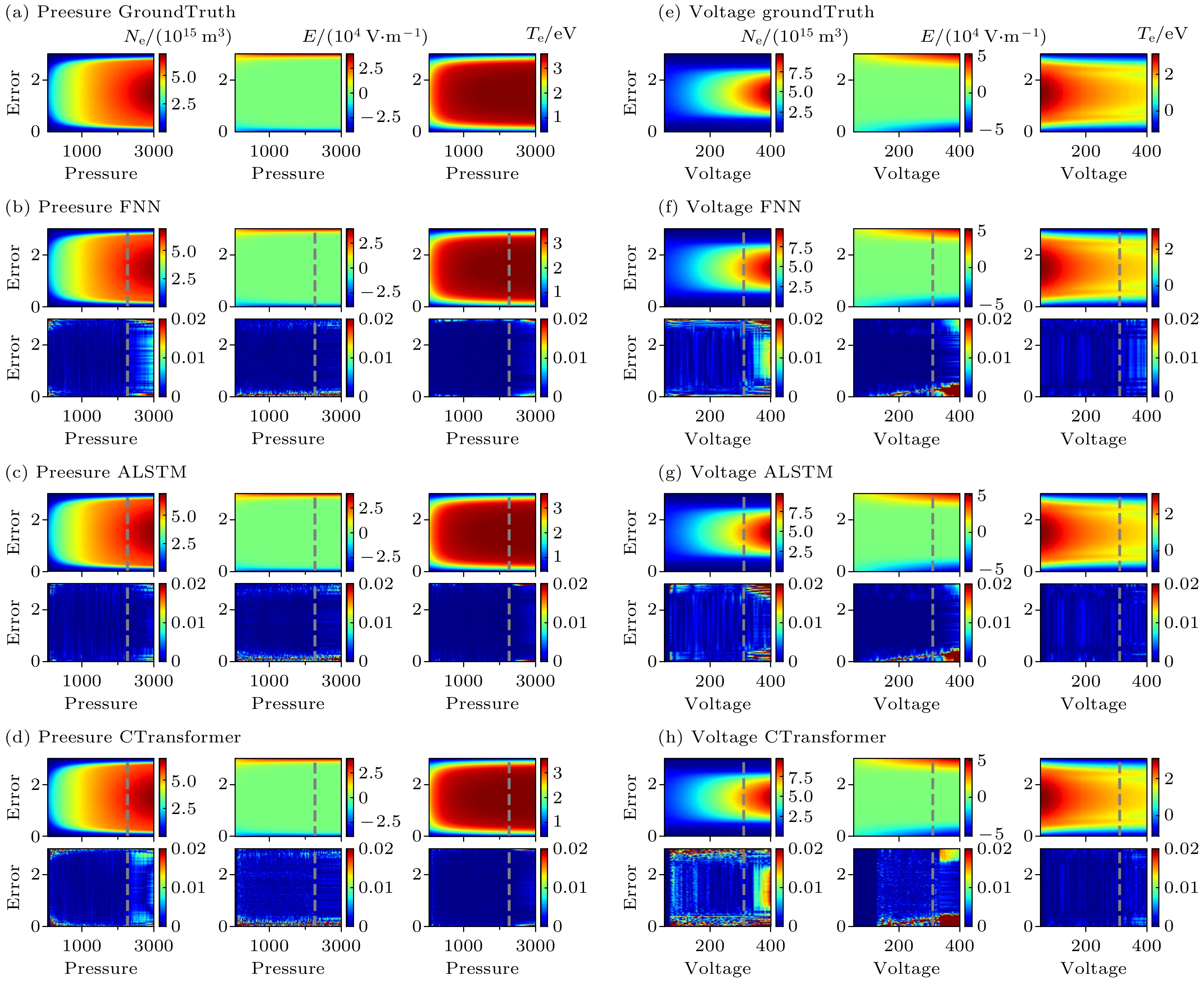 Figure 4. Time-averaged spatial profiles of electron density, electric field, and temperature. Panels (a), (e) show the ground truth from a fluid/MC simulation. Predictions from the FNN ((b), (f)), ALSTM ((c), (g)), and CTransformer ((d), (h)) models are compared against the ground truth under varying pressure (left columns, (b)–(d)) and voltage (right columns, (f)–(h)). Each panel for the models shows the prediction and its normalized absolute error (NAE) distribution. The vertical dashed line separates the training data (left) from the test data (right).