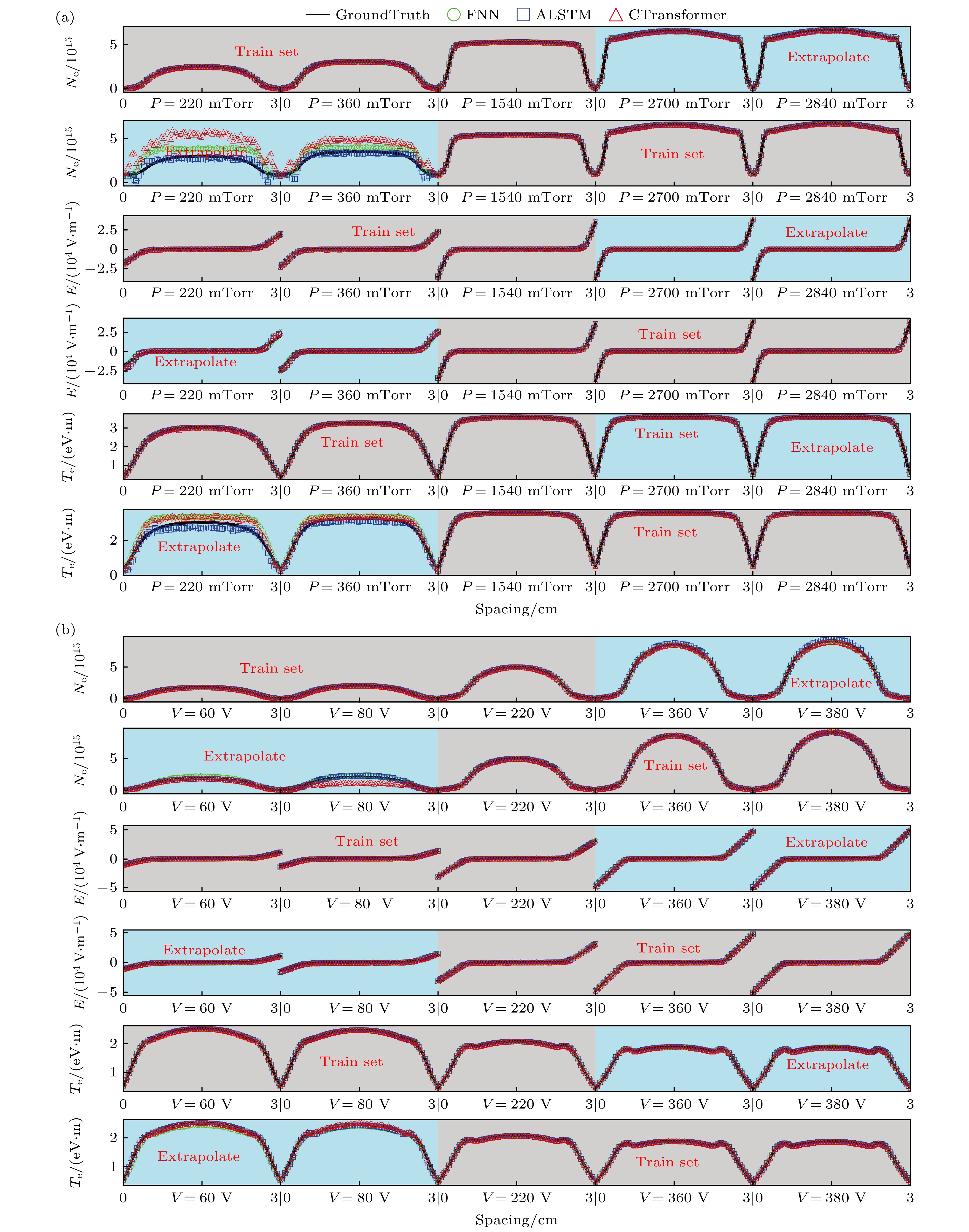 Figure 5. Extrapolation performance of FNN, ALSTM, and CTransformer for time-averaged spatial profiles of electron density, electric field, electron temperature on (a) the pressure set and (b) the voltage set(Electrode spacing is 0–3 cm). The blue-shaded area represents the extrapolation set, while the gray-shaded area is the training set.