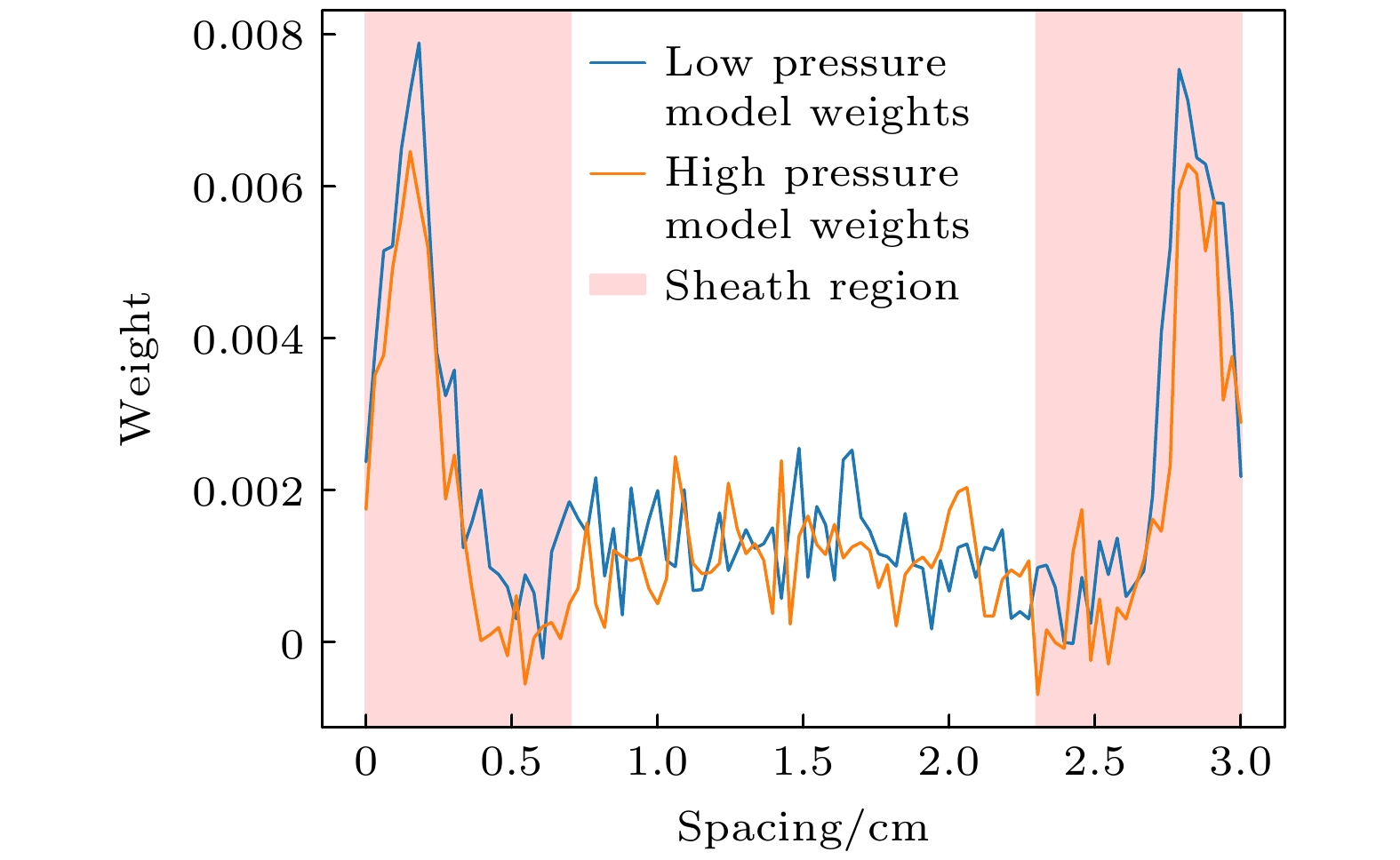 Figure 6. The weight distribution map of the input layer for the ALSTM model, where the blue and yellow lines represent the input layer weight distributions of the ALSTM models trained using low-pressure and high-pressure data, respectively, with the red region indicating the sheath layer weight distribution.