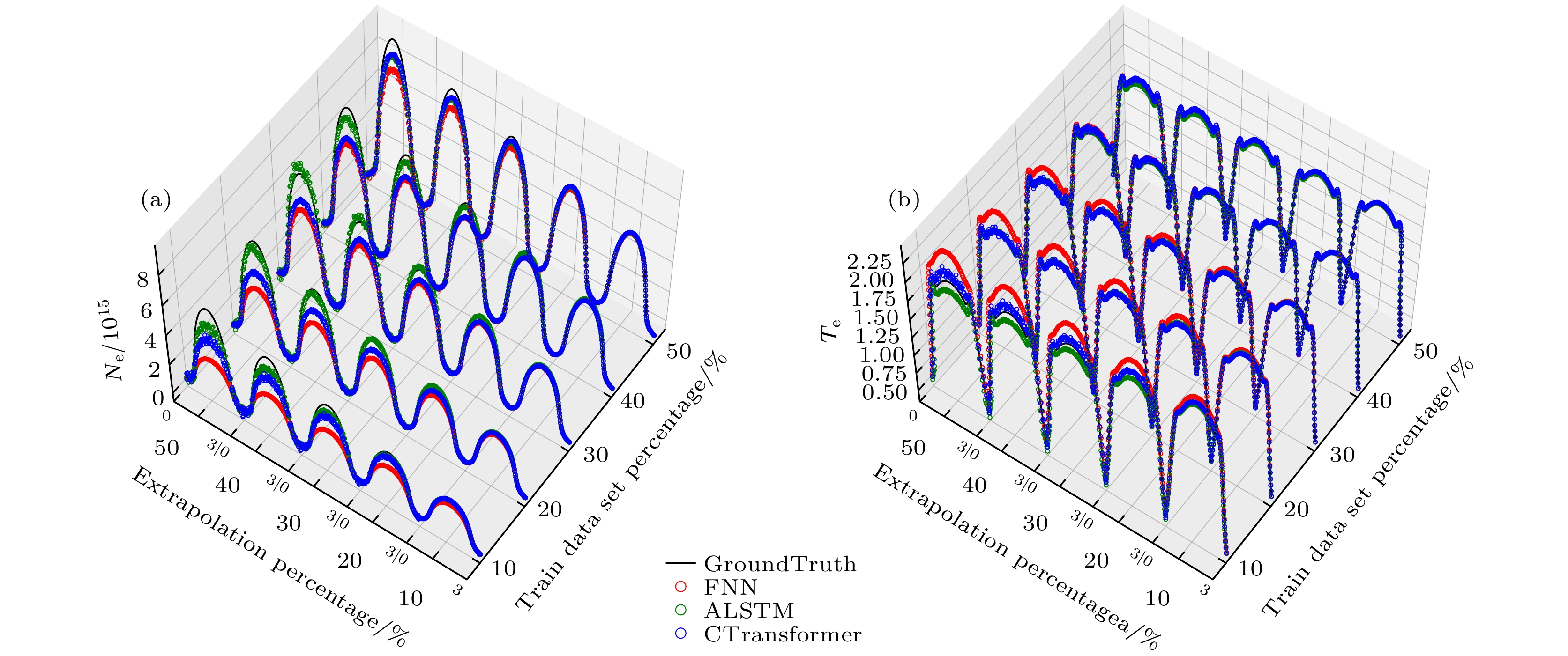 Figure 7. Spatial distributions of electron density (a) and electron temperature (b) predicted by FNN, ALSTM, and CTransformer models at different extrapolation distances when trained on distinct voltage datasets (10%–50% subsets of the total voltage range 50–400 V). These extrapolation distances correspond to 10%, 20%, 30%, 40%, and 50% of the total voltage parameter range calculated from the respective training set boundaries. GroundTruth refers to data from fluid simulations.
