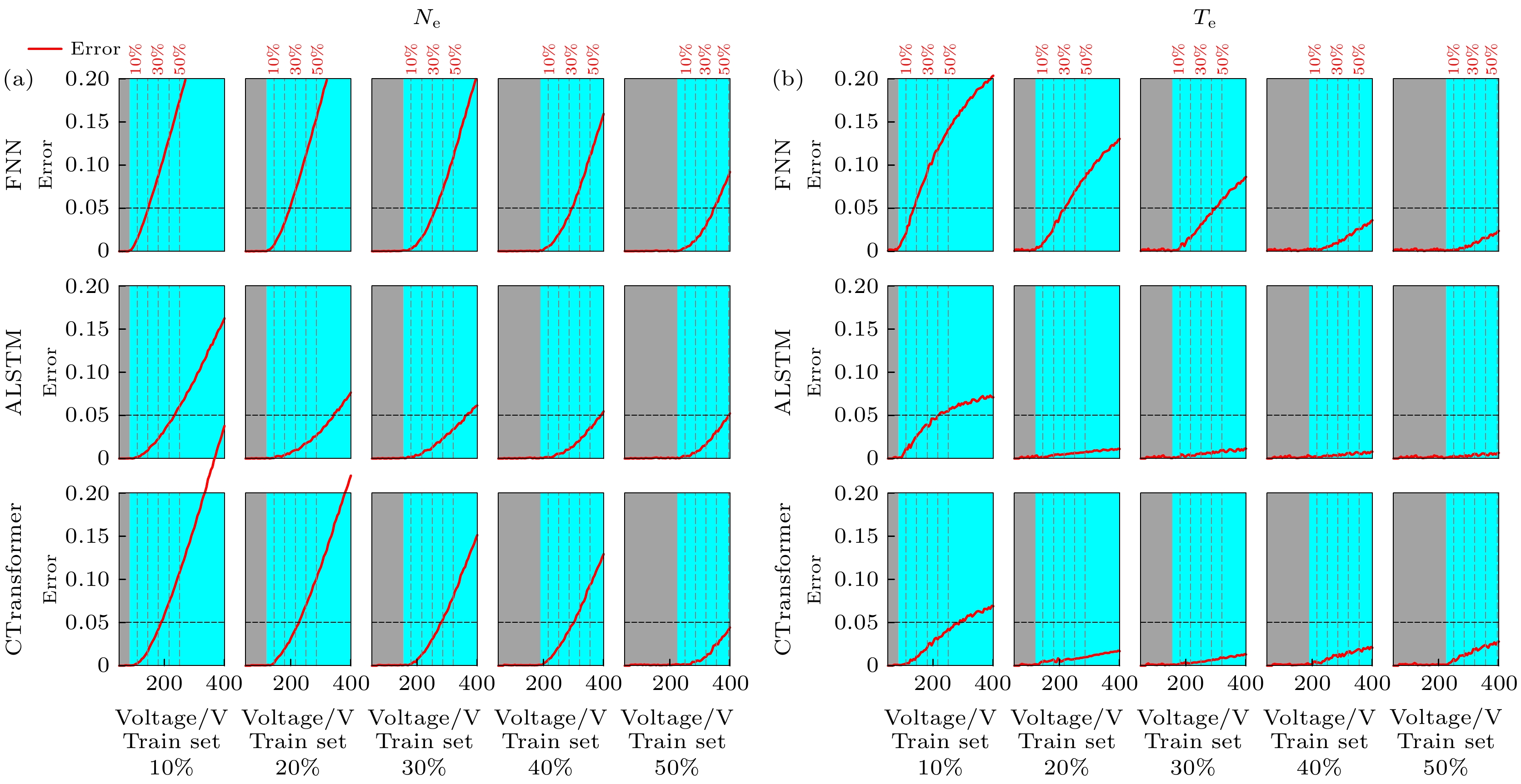 图 8 FNN、ALSTM和CTransformer模型在不同电压数据集(总电压范围50—400 V的10%—50%子集)上训练时电子密度(a)和电子温度(b)的归一化平均空间绝对误差随电压的变化函数. 图中垂直虚线标记了图7(a), (b)中所示的具体外推距离