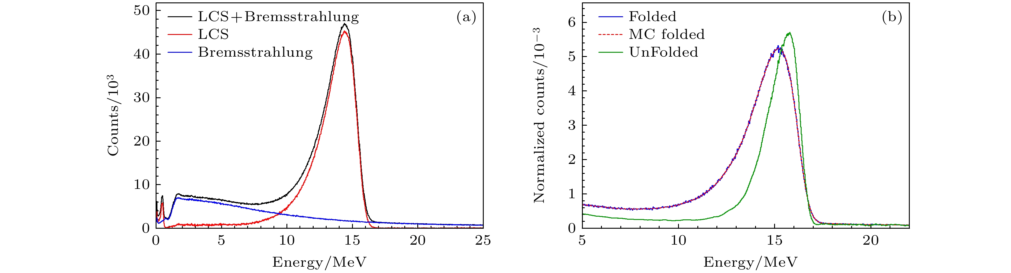 Figure 5.  (a) The measured gamma beam spectrum by the LaBr3(Ce) detector(black solid line), LCS gamma spectrum component(red solid line); Bremsstrahlung(Brem)gamma spectrum(blue solid line). (b) Measured spectrum (blue solid line), Monte Carlo reconstruction (red dashed line); Unfolded true γ-ray spectrum(green solid line).