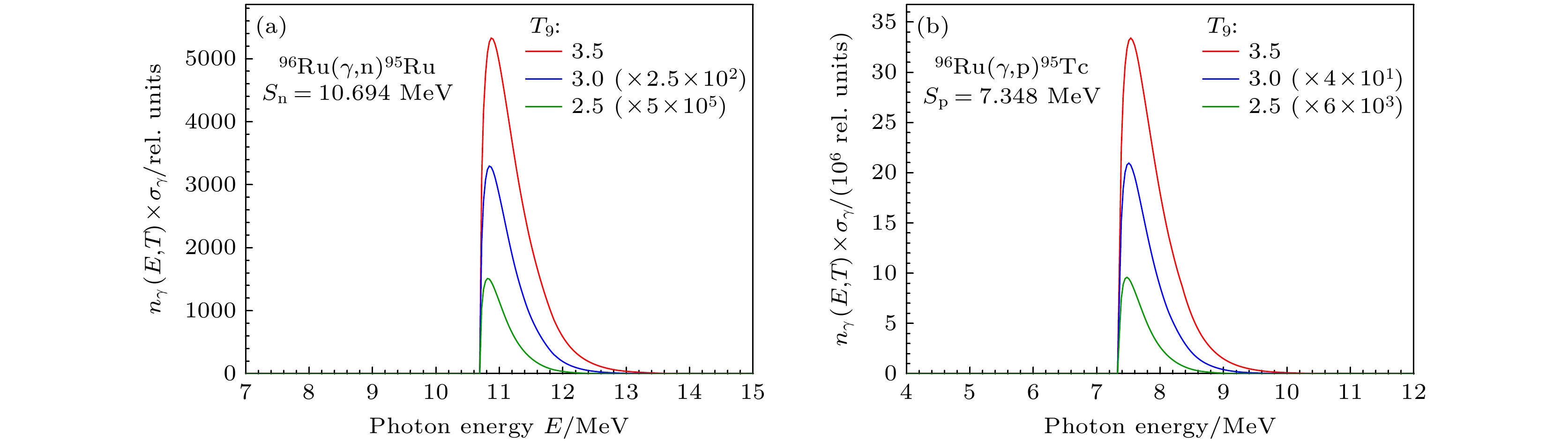 Figure 7.  Gamow window on the ground state of target nucleus (a) $ ^{96} {\rm{Ru}}$(γ, n), (b) $ ^{96} {\rm{Ru}}$ (γ, p)