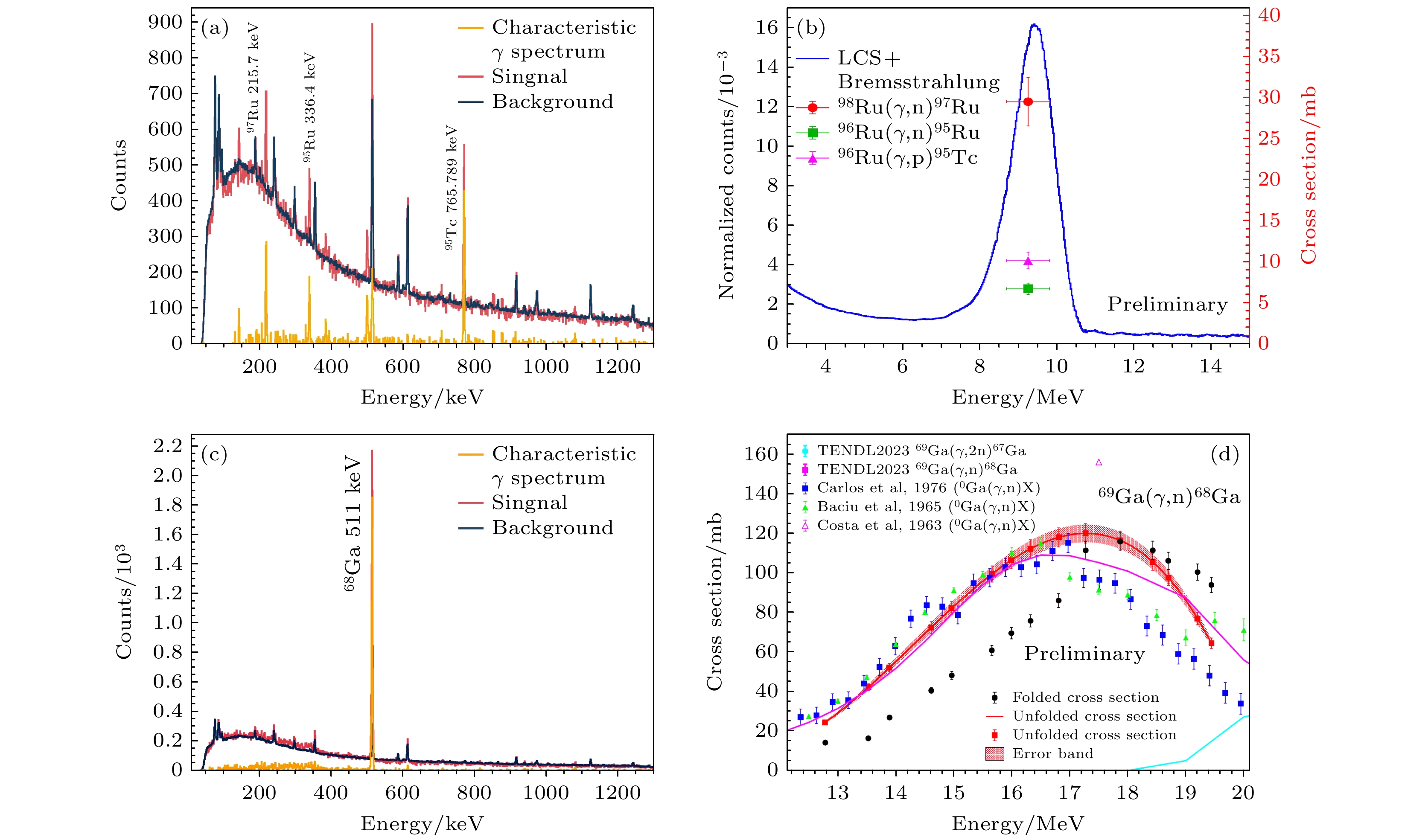图 8  核天体物理相关的活化截面测量 (a, b) $ ^{Nat} {\rm{Ru}}$与(c, d) $ ^{Nat} {\rm{Ga}}$
