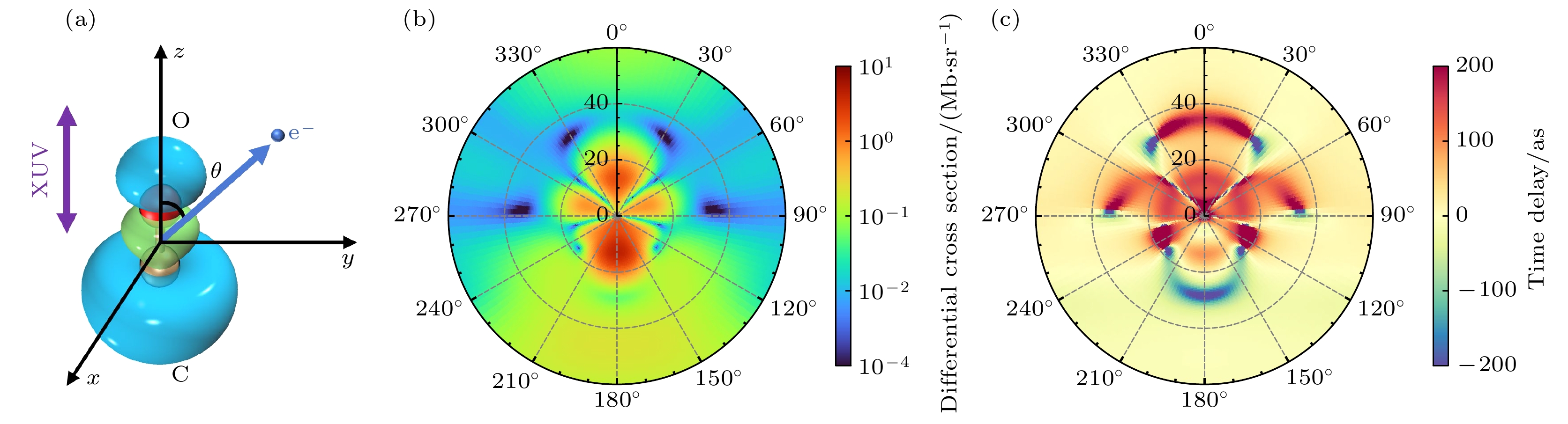 Figure 1. (a) Schematic diagram of photoionization from the 5σ orbital of CO molecule; (b) differential photoionization cross section and corresponding (c) differential photoionization time delay for the $ 5\sigma \to k\sigma $ channel at the equilibrium internuclear distance $ R = 1.13$ Å. The photoelectron energy ranges from 1.5 eV to 60 eV