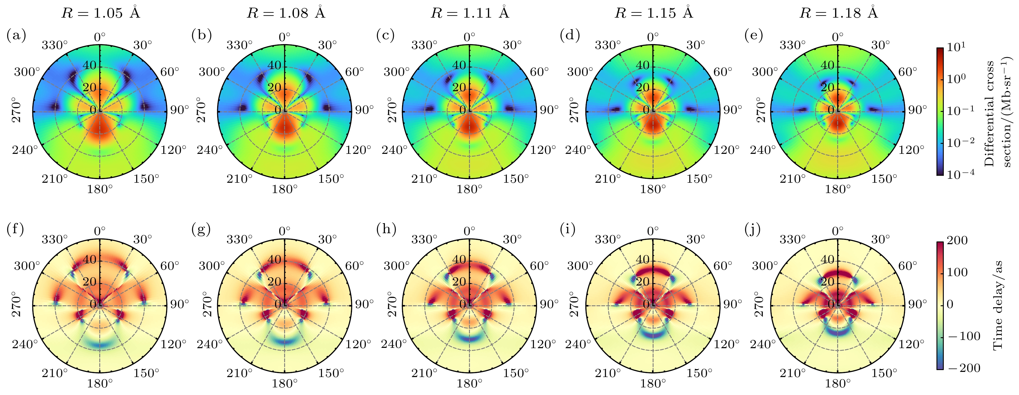 Figure 2. Angle- and energy-resolved differential photoionization cross sections (a)–(e) and time-delay (f)–(j) maps of the $ 5\sigma \to k\sigma $ channel in CO at various internuclear distances R = 1.05, 1.08, 1.11, 1.13, 1.15, and 1.18 Å.