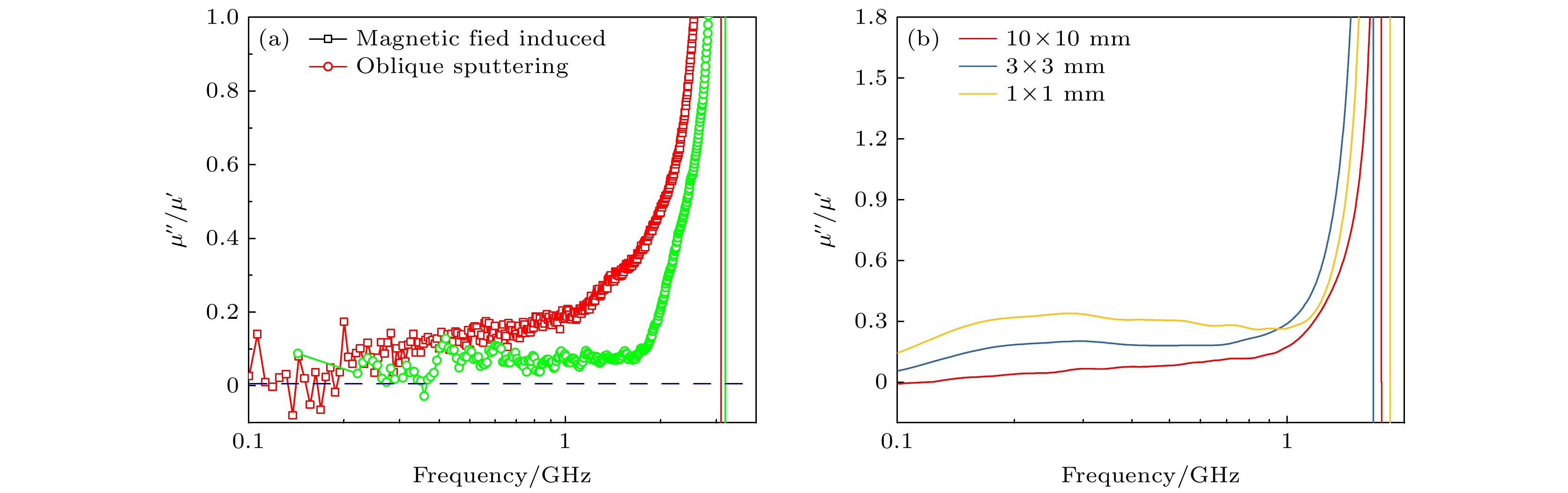 图 10 (a) 115 Oe磁场诱导与17°倾斜角下沉积的FeCo-Ti-O磁膜的高频磁损耗; (b)不同尺寸的[FeCoSiB(100 nm)/NiFe(5 nm)]3的高频磁损耗[78]
