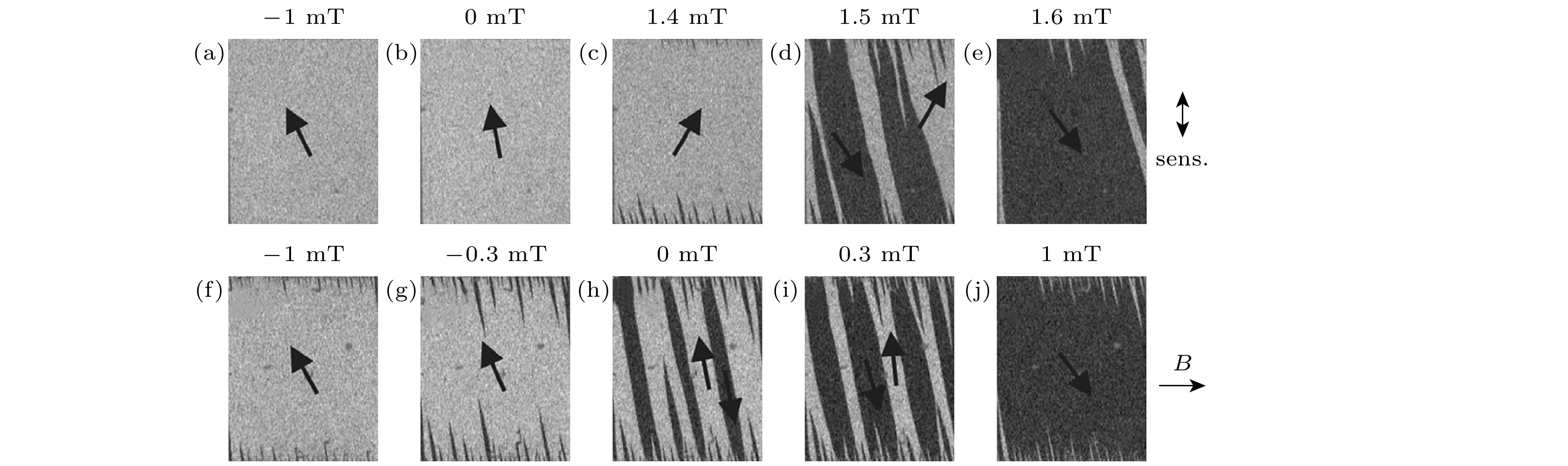 图 12 不同厚度的图形化FeCoSiB薄膜的Moke照片 (a)—(e) 50 nm; (f)—(j) 300 nm. 样品首先沿负磁场方向饱和, 然后降场, 磁矩方向沿箭头方向所示[79]