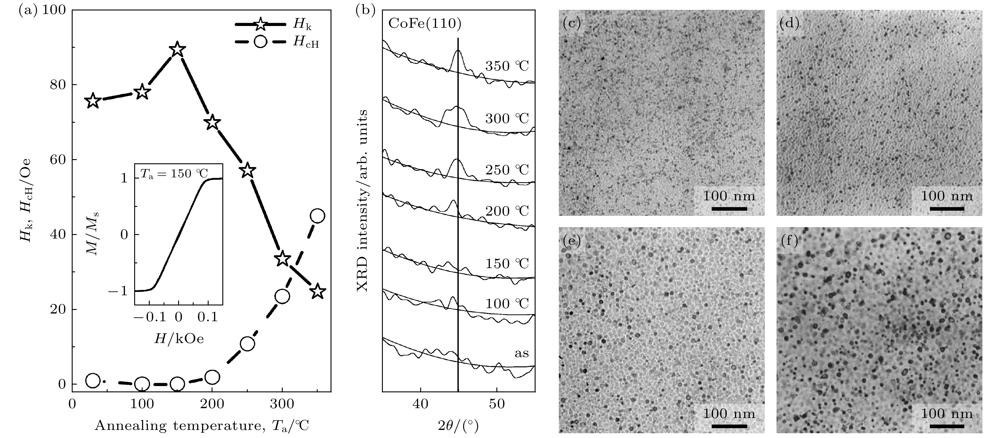 图 14 (a) FeCoHfO薄膜的诱导各向异性场和难轴矫顽力随退火温度的变化情况; (b) 不同温度退火后测得的XRD谱, 图中直线对应CoFe(110)峰[84]; (c) 300 K(未退火), (d) 373 K, (e) 473 K, (f) 573 K退火后FeCo(体积分数为30.5%)-SiO2纳米颗粒膜的TEM照片[85]