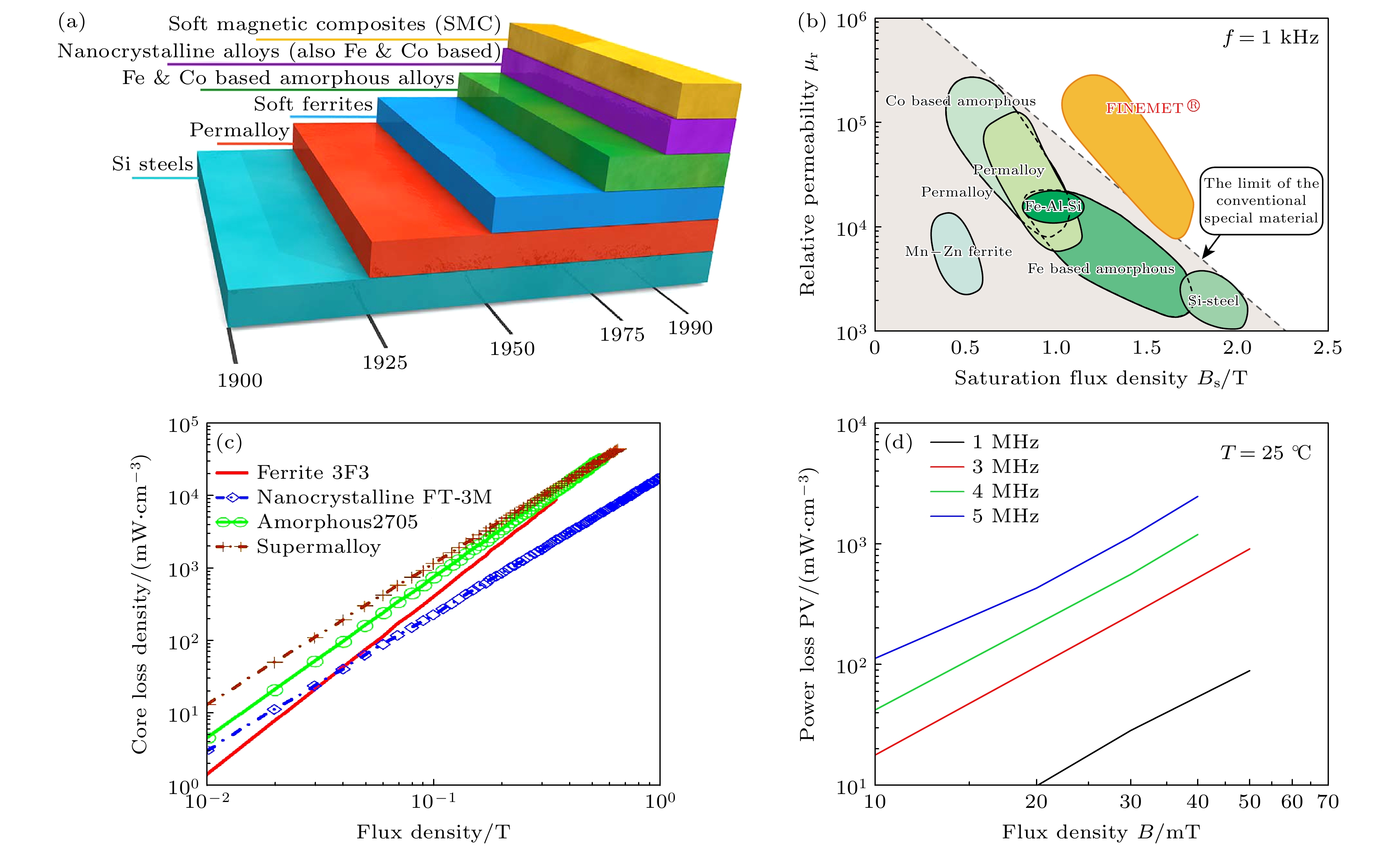 图 2 (a) 软磁材料的发展历程[25], 硅钢片、坡莫合金、软磁铁氧体、Fe(Co)基非晶、纳米晶和复合磁粉芯; (b) 不同软磁材料在1 kHz下的性能对比图[30]; (c) 不同软磁材料在100 kHz功率损耗[30]; (d) 横电东磁DMR 52 W锰锌铁氧体在不同频率下的功率损耗