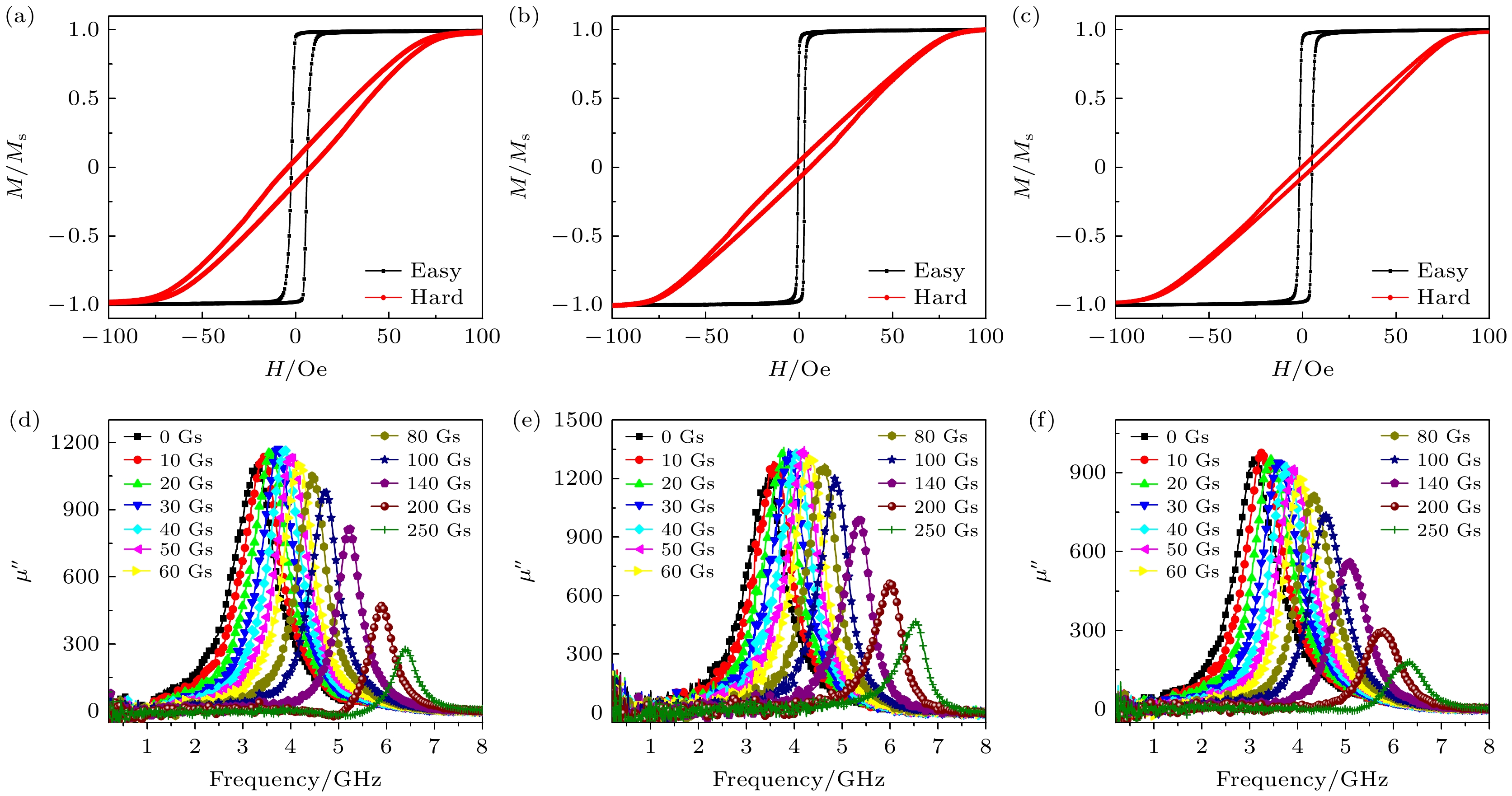 图 8 不同倾斜角度β溅射沉积的FeCoTiO磁膜的M-H曲线 (a) 10°, (b) 17°, (c) 32°; 不同倾斜角度β溅射沉积的FeCoTiO磁膜低场FMR虚部磁导率测试曲线 (d) 10°, (e) 17°, (f) 32°