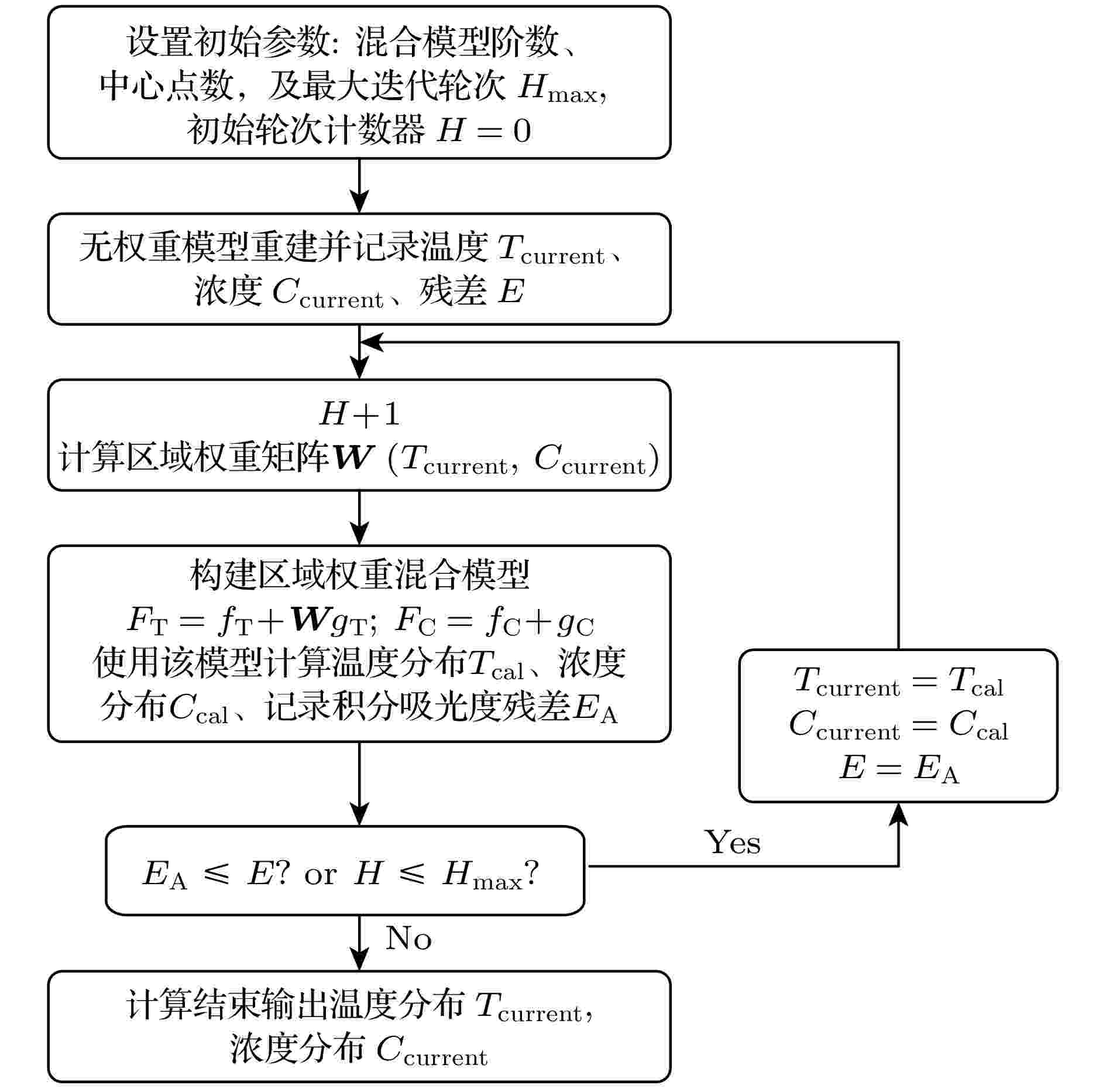 Two-dimensional reconstruction method of combustion field temperature and gas concentration based on adaptive region weight mixing model