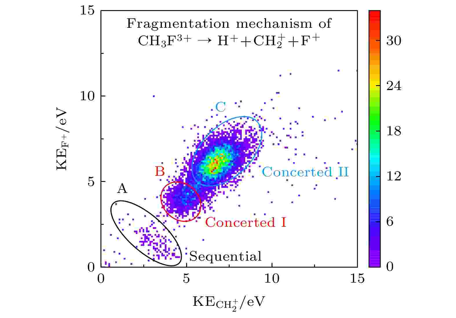 Investigating molecular fragmentation mechanisms and the kinetic energy distributions of fragments can offer crucial insights into their roles in plasma physics, radiation-induced damage in biological tissues, and interstellar chemistry. In this study, we conduct the experiments on collision between 3 keV/u ${\rm Ar}^{8+} $ ions and CH3F molecules by using a cold target recoil ion momentum spectrometer (COLTRIMS).We focus on the three-body fragmentation channel H++$ {\mathrm{C}\mathrm{H}}_{2}^{+} $+F+ resulting from C—F and C—H bond cleavage in CH3F3+ ions, and measure the three-dimensional momentum vectors of all fragment ions. The fragmentation mechanism involved is analyzed using ion-ion kinetic energy correlation spectra, Newton diagrams, Dalitz plots, and other correlation spectra.Our results reveal two different dissociation mechanisms for the H++$ {\mathrm{C}\mathrm{H}}_{2}^{+} $+F+ channel, i.e. concerted fragmentation and sequential fragmentation, with the former one being dominant. In the sequential fragmentation process, H+ and the intermediate CH2F2+ are firstly formed, followed by further fragmentation of the intermediates into $ {\mathrm{C}\mathrm{H}}_{2}^{+} $ and F+. No sequential pathways involving HF2+ or $ {\mathrm{C}\mathrm{H}}_{3}^{2+} $ intermediates are identified. Furthermore, we observe two types of concerted fragmentation processes with different dynamical characteristics, suggesting that hydrogen atoms in CH3F3+ may occupy different chemical environments. This phenomenon can originate from either molecular isomerization producing different structural geometries or the Jahn-Teller effect leading to inequivalent C—H bonds. This study reveals the three-body dissociation dynamics of CH3F3+ induced by highly charged ion collisions, highlighting the significant role of the Jahn-Teller effect or molecular isomerization in the ionic dissociation of polyatomic molecules.